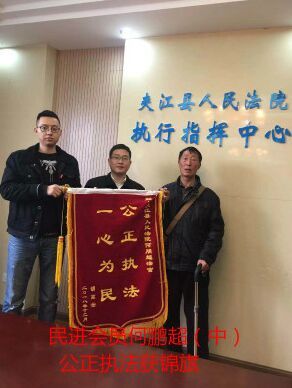 近日,民进夹江支部主委、夹江县人民法院执行员何鹏超在执行一件买卖合同纠纷案件中,为申请执行人全部执行回案款48000余元。据了解,由于被执行人在诉讼阶段和执行阶段不积极配合,申请执行人身体行动不便,再加上路途遥远,维权之路较为艰辛。何鹏超在执行中运用强制措施及时高效、公正廉洁,有力地帮助申请人合法权利得以实现,维护了司法的权威。申请执行人深受感动,从攀枝花送来“公正执法 一心为民”锦旗一面。