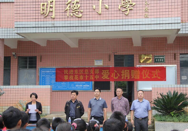 捐赠仪式上,中心校吴副校长代表学校对民进市委、市十五中学的捐赠表示感谢;黄元林书记、童琪副校长也激励同学们要认真学习,不断取得进步。郝刚副主委代表民进市委对市十五中的捐赠支持表示感谢,并讲到,关心教育发展,帮助困难学生是民进应尽的责任,就是要通过我们的工作,让大家都来关心、帮助农村贫困孩子的学习,切实帮助农村学校提高教育质量,使每一位农村学生都能成为一个对社会有用的人,为攀枝花全面建成小康社会做好人才培养。