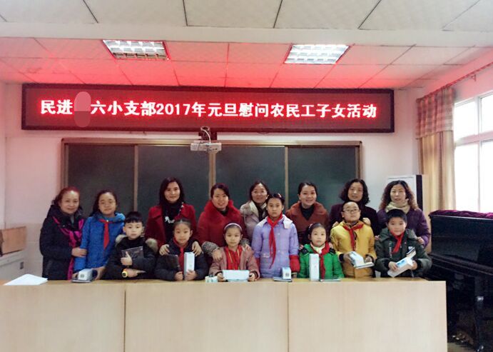 1月4日,内江民进六小支部开展了慰问农民工子女活动。首先,曾丽主委向几名品学兼优的农民工子女学生简单地介绍了民进组织。接着,她亲切地询问了孩子们的家庭状况,了解了他们学习生活情况。从询问中得知,孩子们都是农民工子女,父母大部分都在外打工,由爷爷奶奶在家照看,在城里居住的房屋大多是租住的,家中生活比较拮据,但他们的学习成绩在班上名列前茅。最后,民进会员们,向孩子们送上了新年礼物,希望孩子们在学习上再接再厉,新的一年里更上一层楼!孩子们接到礼物后非常高兴,纷纷表示会继续努力学习,不辜负老师们的期望!
