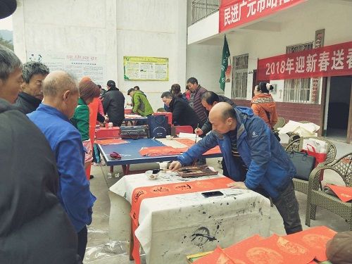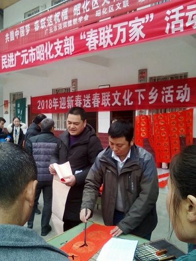 新春来临之际,为增添节日氛围,弘扬传统文化。2月4日,民进昭化支部邀请市、区楹联学会及区作家协会部分书画家20余人在昭化区沙坝乡场镇开展了“共圆中国梦•春联送祝福”文化进万家活动,为广大群众免费书写春联,送上了2018年新春第一份祝福。