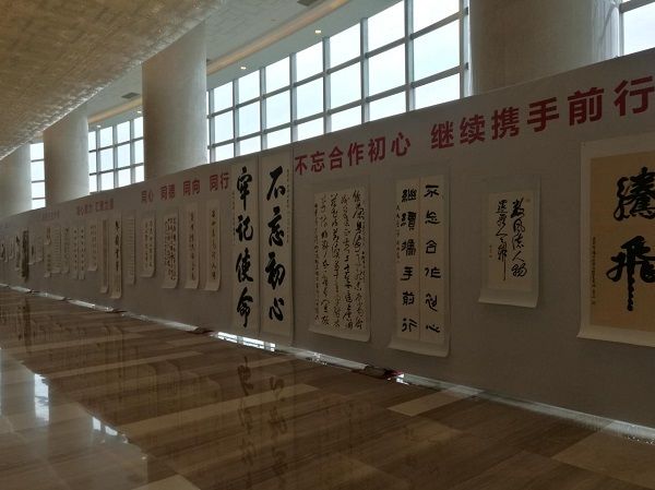 在会议厅外的统一战线书画摄影展长廊里,民进精心挑选报送的5幅书画作品在此展出。