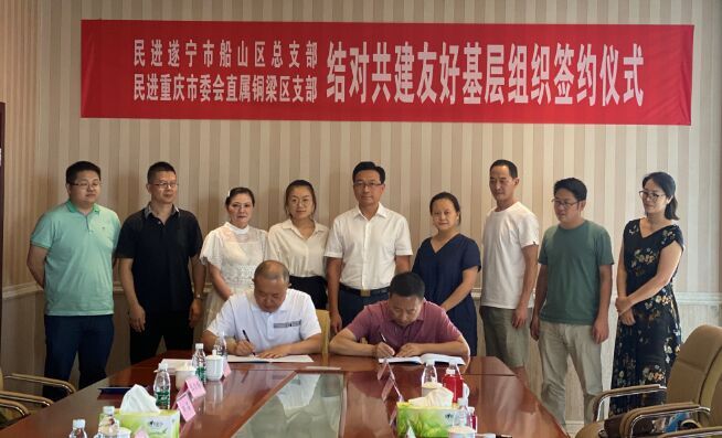 为深入落实习近平总书记关于“推动成渝地区双城经济圈建设,在西部形成高质量发展的重要增长极”的战略部署,充分发挥川渝两地民进组织的优势,助推两地经济社会发展,提升履职能力建设,7月29日,船山区政协副主席、民进船山区总支主委邓军率总支班子与民进重庆市委会直属铜梁区支部签约,结对共建友好基层组织。铜梁区政协副主席、民进铜梁区支部主委曹定福、中共铜梁区委统战部常务副部长何勇、中共遂宁市船山区委统战部党派股股长姜黎等参加活动。