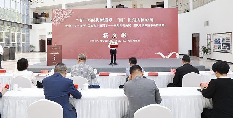 首先,受安居区委书记吴军委托,杨文彬代表区四大班子和81万安居干部群众,向各位领导、各位嘉宾表示热烈欢迎和衷心感谢。他表示,此次川渝民进开明画院走进安居,必将激励安居以文化大繁荣带动经济大发展。安居将坚持“对标更高标、出手就出彩、完成即完美”的工作标准,借势双圈建设、借智民进等民主党派、借力巴蜀文旅走廊,持续巩固开明画院作品展成果,努力书画安居、绘就安居、发展安居。