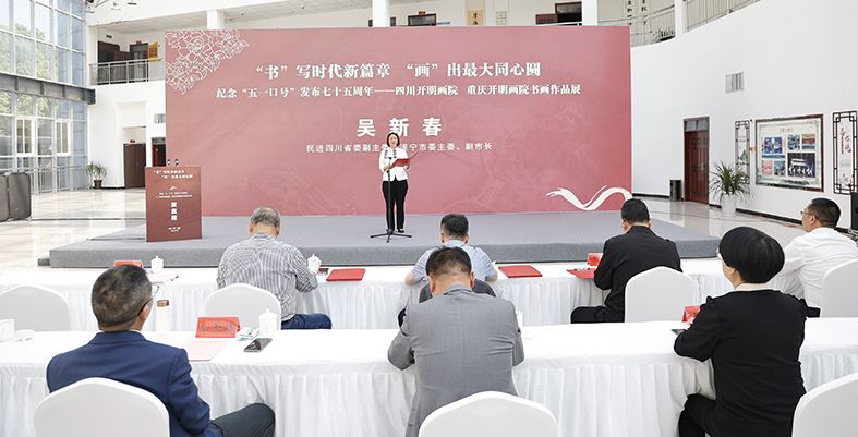 吴新春代表民进四川省委会、遂宁市人民政府、民进遂宁市委会,向大家的到来表示热烈欢迎。她说,自成渝地区双城经济圈建设正式上升为国家战略以来,四川、重庆民进积极响应,在教育、文化、经济等方面携手并进、共同发力、精诚合作,积极展现民进智慧、发挥民进力量、体现民进担当。此次书画作品展,四川、重庆民进艺术家们用精湛的技艺抒写时代精神,用生动的画作展示人民生活,讴歌祖国日新月异的变化和举世瞩目的成就,表达了民进人永远“跟着共产党走”,永远“在正道上行”的决心和勇气,展现了精湛的艺术造诣和昂扬的精神风貌。