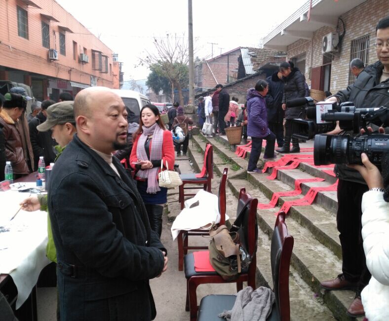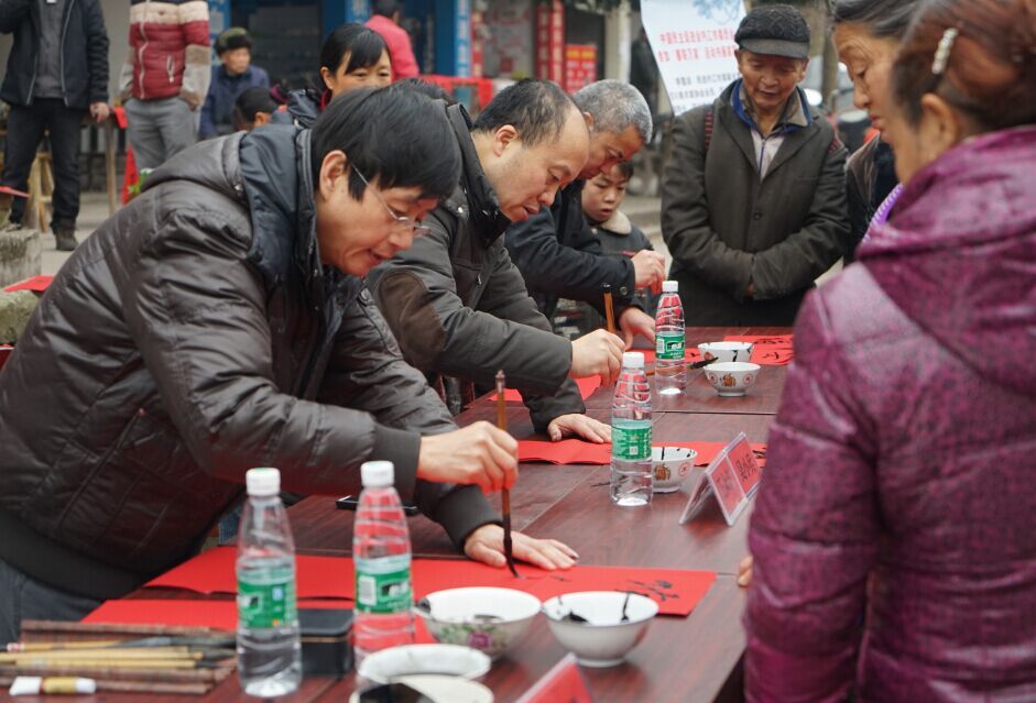 为响应民进中央关于在全会开展“春联万家”活动的号召,2016年1月19日上午,民进内江市委在东兴区三烈乡开展“春联万家”活动。市委会组织会内的4位书画家并邀请了3位民进之友(均为中国书法家协会会员)为当地群众书写春联。活动现场人头攒动,热闹非凡,赶场的群众得知有送春联的活动,都纷纷围拢了过来,请书画家为他们写下一幅幅满怀希望,寓意吉祥的春联。活动持续了两个多小时,直到所准备的纸张一写而空,现场被红火的春联装饰成了红色的海洋。部分没抢到春联的老百姓都满脸失望,还追着书画家们问:还来吗?