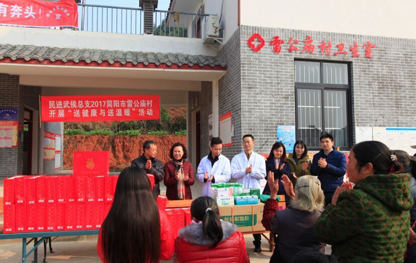2017年11月26日,民进武侯总支副主委张艳群带领于军桥、邓炜、王淇、陈俊竹、段仁建等总支会员一行,前往简阳市新星乡雷公庙村开展了“送健康、送温暖”的帮扶活动,为解决部分群众看病难问题、法律释疑解惑等献出了一点绵薄之力。