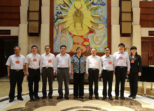 四川省中华职业教育社主任、副主任与中华职教社理事长张榕明(中)合影,左二为杨建德