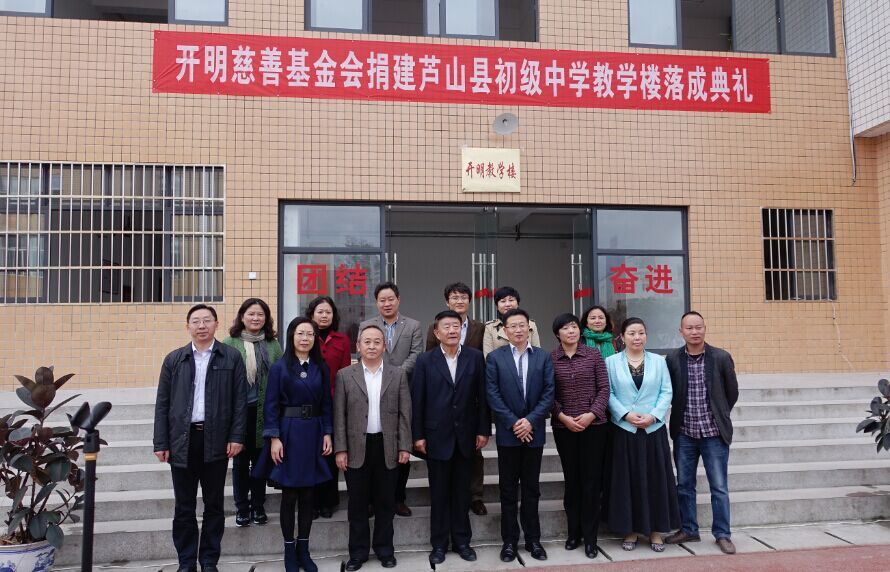 11月8日上午,民进中央开明慈善基金会“雅安抗震救灾专项基金”捐赠项目——开明教学楼竣工仪式在芦山县初级中学举行。王佐书、刘文胜、赵川荣,开明慈善基金会、捐助方代表学大教育集团、中共四川省委统战部、雅安市委统战部、民进四川省委等相关人员以及芦山县有关领导、芦山县初级中学的100多名师生参加了活动。竣工仪式由中共芦山县县委统战部部长王志鸿主持。