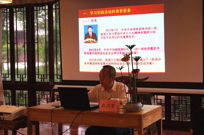 随后,赵川荣为眉山会员们做了题为《深化认识,抓好落实,力推学习实践活动不断深入开展》的主题讲座。他从背景、基本要求、定性三个方面介绍了学习实践活动的总体概况,回顾了民进20年来5次主题教育活动的实质与内涵,介绍了本次学习实践活动的特点,并再次明确了省委会对此的要求。他提出,本次学习实践活动主题更加鲜明、目标更加明确、要求更加严格。各级组织及会员要抓学习、抓实践,必须解决好思想认识到位的问题,要做到学习有深度、认识有提高、活动有特色、工作上台阶。他还强调,开展好学习实践活动,既是紧跟时代步伐,不断增强组织凝聚力、扩大影响力的需要,也是民进在中国共产党领导的多党合作和政治协商道路上继续前行积淀正能量的需要,更是我们履行“为执政党助力、为国家尽责、为人民服务”使命的需要。