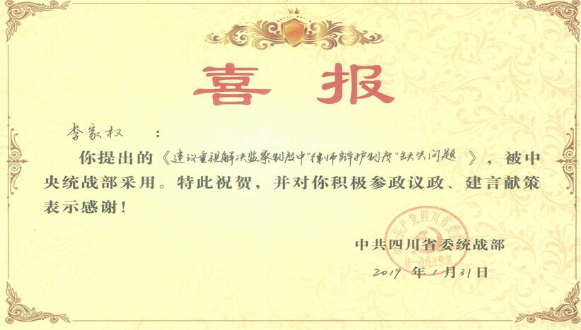 近日,民进四川省直工委十支部主委、民进四川省委会法制工作委员会副主任李家权撰写的社情民意信息《建议重视解决监察制度中“律师辩护制度”缺失问题》被中央统战部《零讯》采用,并报送中央领导参阅。该信息是2018年12月中央统战部向中央办公厅报送的15件信息中,唯一的1件来自四川省的信息。四川省委统战部就此件信息给民进四川省委发来喜报,对李家权同志积极建言献策,为推动社会发展提供高质量社情民意的履职行为予以了表彰。