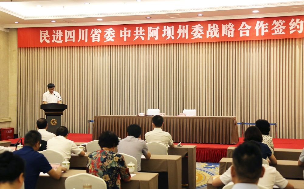 6月27日,民进四川省委—中共阿坝州委战略合作签约仪式在成都举行。民进中央副主席、四川省委主委张雨东,中共四川省委统战部副部长陈武,中共阿坝州委书记刘坪,阿坝州人民政府州长杨克宁;四川民进各市级组织负责人、省委会机关各处室负责人,中共阿坝州党委、阿坝州人民政府相关部门负责人共五十余人出席仪式。