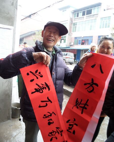 民进内江市委的6位书画家们冒着严寒早早的便来到了位于城区30公里外的界牌社区,摆上桌子,摊开笔墨纸砚,准备为这里的社区居民送上新年的祝福和初春的暖意。赶场的农民围了过来,逛街的居民走了过来,连流着鼻涕的小娃娃也凑了过来,争着围着要春联。这可忙坏了书画家们,他们一边帮老百姓挑选中意的春联内容,一边泼墨挥毫将一幅幅春联送到百姓手中。接过春联,界牌社区的居民绽开了幸福的笑容,一个劲儿的说谢谢。而原本预计1个半小时的活动持续了3个小时,直到晌午居民才陆续散去。据不完全统计,活动共送出春联400余幅。尽管累得直不起腰,尽管新买的毛笔已经废掉,但听到居民们真诚的“谢谢”二字,内江民进的书画家们也是倍感欣慰。