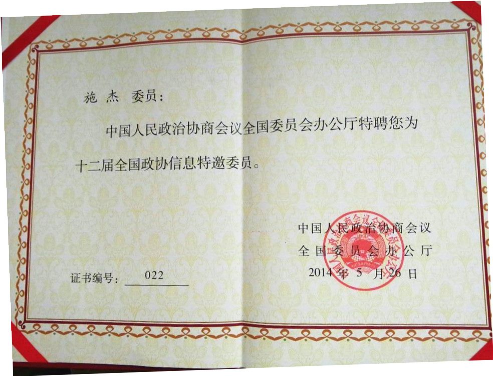 此外,施杰已经3次获邀参加自2013年10月开始重新启动的全国政协双周协商座谈会。