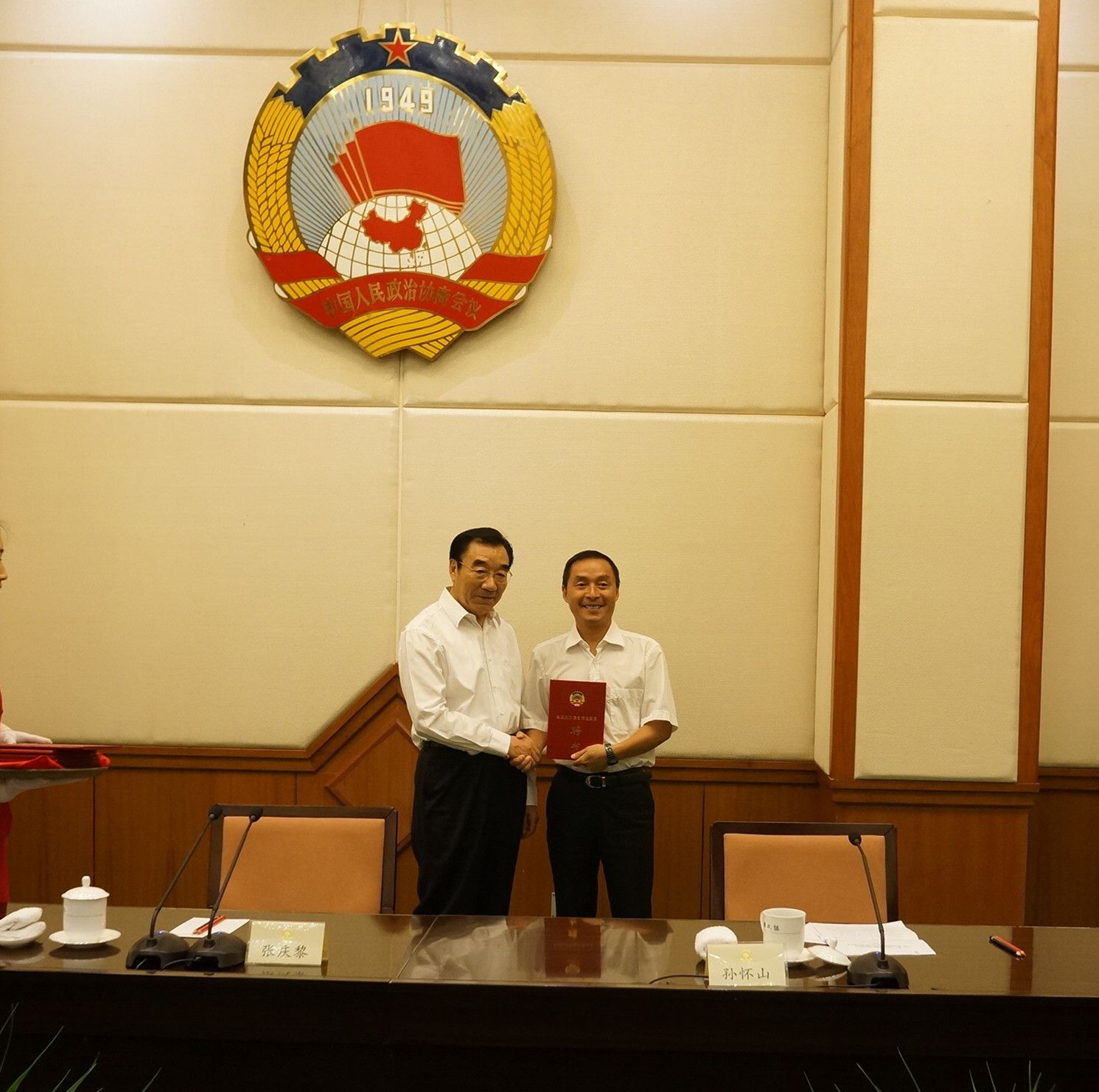 全国政协副主席兼秘书长张庆黎(左)为施杰(右)颁发聘书